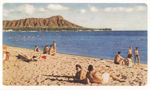 "United Airlines - Lazy, carefree days on the sunny sands of Waikiki Beach are one of the many highlights of United's low-cost inclusive 'Hawaiian Vacations.' Ask United or your Authorized Travel Agent for details. -- Speed Your Mail by Air" Card No. CA-636, printed in U.S.A. From United Air Lines Kodachrome.