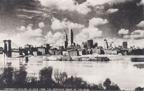 "Cincinnati Skyline as seen from the Kentucky Shore of the Ohio. P.S. We are seeing all the sights traveling with a Conoco TOURAIDE. It's wonderful! Your MIleage Merchant at his Conoco Statio will tell you how to get one."