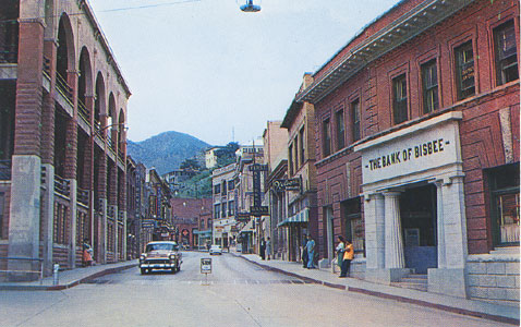 "Downtown Bisbee, Arizona. Looking up Main Street toward Castle Rock. The streets in Bisbee are so steep that there are no mailmen -- and no first class post office." Card No. P37468.