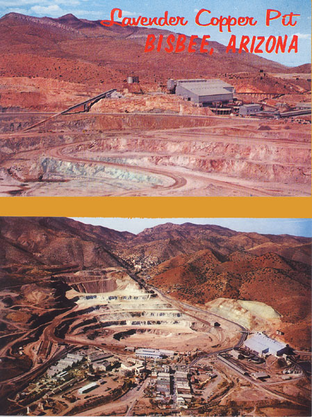 Phelps Dodge Corporation's Lavender Open-Pit Copper Mine -- This mining operation is unique in that the pit is being dug where in 1953 lay U. S. Hwy. 80 lined with business houses and flanked by homes of the two cities Bisbee and Lowell. The job of moving all these buildings to new sites south and west of town and relocating the highway along what is now the east rim of the pit occupied two years. -- L-220" Card No. C6650.
