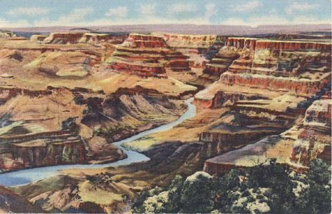 "GC-10 -- Looking North From the Watch Tower at Desert View. Don't miss seeing the Canyon from the Watch Tower, from which one can look for miles up the turbulent Colorado River with an ecellent view of the North Rim and the Painted Desert." One cent Post Card, Postmarked October 2, 1951.
