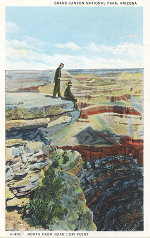 Grand Canyon National Park, Arizona. "Long before the first white men visited the Grand Canyon, the Indians were enjoying the inspiring spectacle of its great distances, its majestic moods and its ever-changing colors." Card No. H-419; 1A2936, North From Near Hopi Point. Postmarked June 24, 1936.