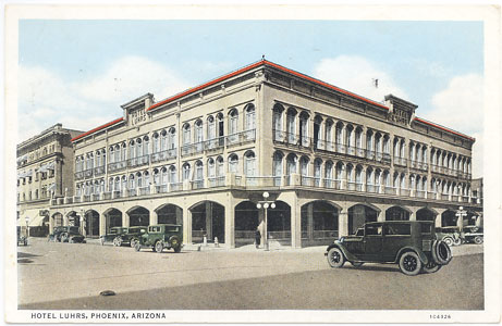 Hotel Luhrs, Phoenix, Arizona "A Homey Hotel for Homey People In the Valley of the Sun". Card No. 104926. Postmarked June 17, 1936