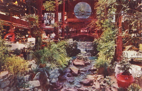 "Dining Room -- Brookdale Lodge, Brookdale, Calif. World famous for the Natural Muntain Brook, running through the Dining Room midst the abundant growth of redwoods and ferns." Post Card No. C6271, postmarked October 22, 1956.