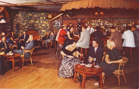 "Burl Room" -- rustic Cocktail Lounge at World Famous Brookdale Lodge. "Brookdale, Santa Cruz County, California. This popular rendezvous room adjoins the World Famous Dining Room with the natural mountain brook flowing through it. Come linger with us beside the singing brook!" "In All the World Nothing like It." Post Card No. SC2210.