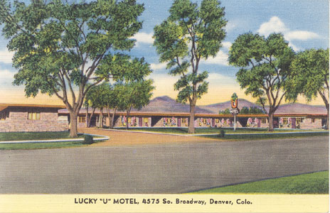 Lucky "U" Motel, 4575 So. Broadway, Denver, Colo. 27 Blks. South of Denver, near Centennial Park. Completely furnished apartments. Reasonable rates. One of the finest in Colorado." Post Card No. K5509, Postmarked September, 1953.