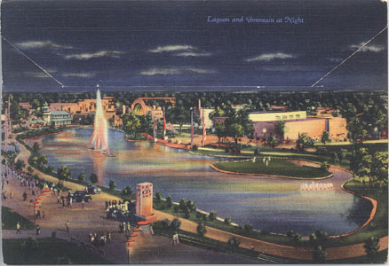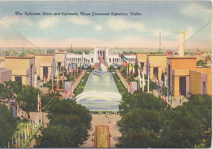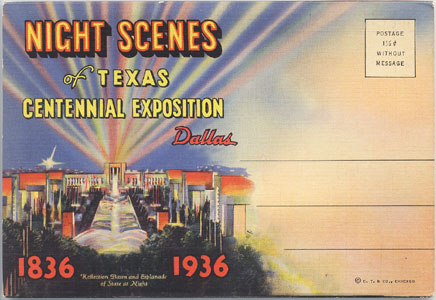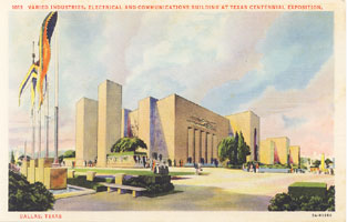 1013 Varied Industries, Electrical and Communications Building at Texas Centennial Exposition Dallas, Texas. One-cent postcard no. SA-H1680. "P.S. Having fine time at the Texas Centennial Exposition, Dallas. When here be sure to see the Elgin Watch display in the Electrical Building."