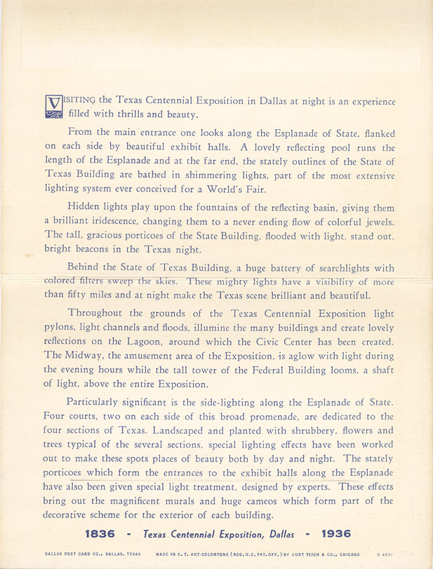 "Hall of State and the Court of Honor State Fair of Texas, Dallas, Texas. Texas Hall of State is a Monument to the People of the entire State of Texas. Built at a cost of $1,200,000.00 of Native Stone. It is a memorial to the pioneers who built an empire out of a great wilderness." Postmarked August 22, 1956.