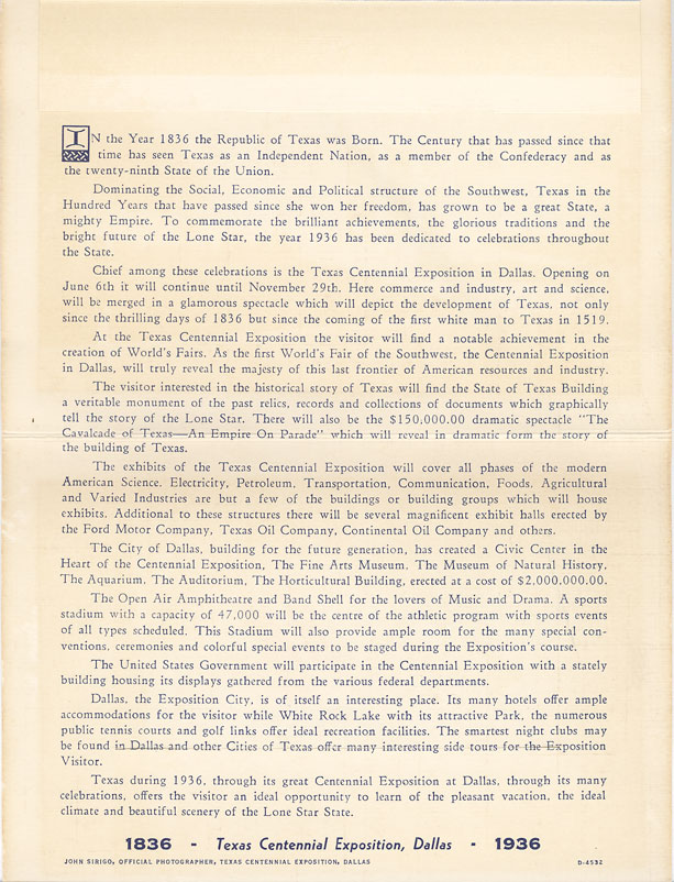 Texas Centennial Exposition, Official Photo SIRIGO. Black & White photograph, III-State Bldg. Postmarked September 18, 1936, Texas Centennial.