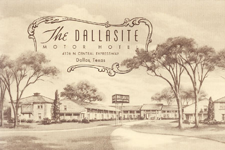 The Dallasite Motor Hotel, 4126 N. Central Edpressway, Dallas, Texas. 58 Refrigerated Air Conditioned Rooms--Covered Auto Parking--Telephones--Radio--Coffee Shop--Television Available--4 minutes from downtown Dallas, on U. S. Highway 75 Phone TAylor 4-0361." Postcard requiring four-cent postage.