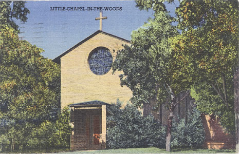 "Little-Chapel-In-The-Woods. Texas State College for Women, Denton, Texas. Little-Chapel-In-The-Woods Designed for small groups and for individual religious worship, the Little-Chapel-in-the-Woods is built of native gray Texas field stone. National Youth Administration boys constructed the building, and students of the Art Department of the College designed and executed such interior features as mosaics, stained glass windows, light and altar fixtures." One-Cent Post Card, Postmarked November 29, 1950.