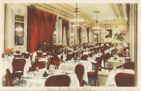 Victorian Room, Palmer House, Chicago. "The beautiful crimson and gold Victorian Room of the Palmer House is famed for quiet charm and the dinner music of the Palmer House Ensemble."