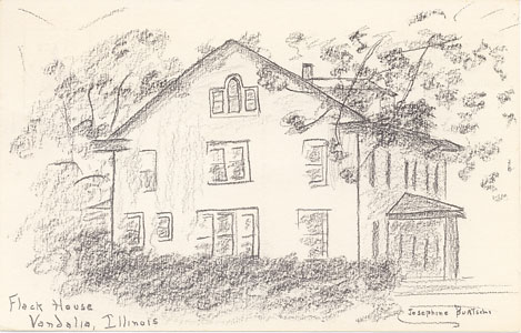 Flack House, Vandalia, Illinois. Sketch by Josephine Burtschi. "Built in late 1820's. Stood in Vandalia as an Inn across from the Statehouse during capitol days, Lincoln, Douglas and the legislators stopped there. It is removed from the original site to its present location a block away." Posted July, 1957.