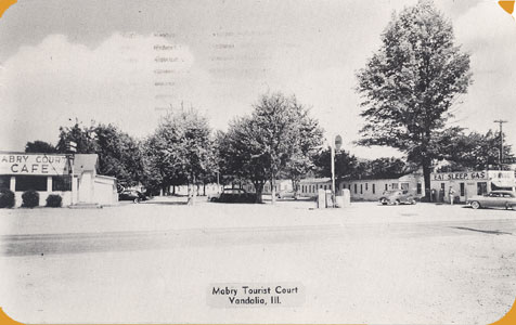 Mabry Tourist Court, Vandalia, Ill. Eat - Sleep- Gas, with Mabry Tourist Court. Northside Vandalia, Illinois. 32 new units, deluxe Restaurant, Shell service on routes U.S. 40, U. S. 51 and State 185. Beauty REst Box Springs and Mattresses, Goosedown pillows. Cozy winter and summer. Always open. Illinois Greates Tourist Mecca." Post Card No. 56261, postmarked June 10, 1957.