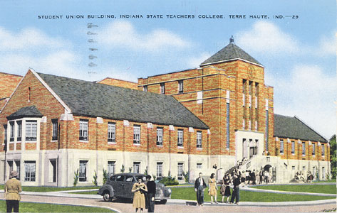 "Student Union Building, Indiana State Teacher's College, Terre Haute, Ind. -- 29. The Student Union Building at Indiana State Teachers College was dedicated in 1940 and is the center of student life on the campus. It contains an auditorium seating 1,800 persons, cafeteria grill, dining rooms, recreation clubrooms, meeting rooms, swimming pool, faculty clubrooms, student lounge, ballroom, offices, and hotel facilities" Post Card No. 31999N, postmarked November 5, 1945.