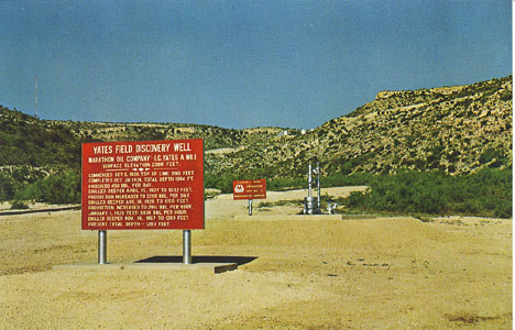 "Discovery Well A No. 1 - Iraan, Texas is proud of the two largest oil wells on the North American Continent, Iraan, Texas." Card No. 020378. Yates Field Discovery Well - Marathon Oil Company I. G. Yates A No. 1, surface elevation 2399 feet.