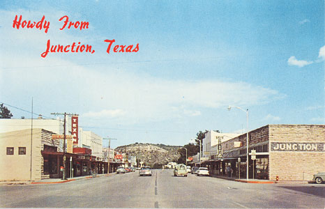 "Junction, Texas - Downtown - U. S. Hi-Way N. 290. Junction, Texas is located 59 miles east of Sonora, and 63 miles west of Fredericksburg, Texas on U. S. Hi-Way No. 2990. JUnction is situated in the forks of the Llano River. In the beautiful "Hill Country", where sportsmen congregate to enjoy the best hunting and fishing in Texas. Most of the ranchers in this area raise sheep and goats, and as a result - Junction's main industry is wool and mohair." Card No. S-47207-2, card purchased June 23, 1970..