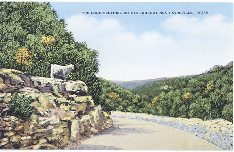 "The Lone Sentinel on His Lookout Near Kerrville, Texas", card no. 10787. "The Angora goat is a symbol of the pre-eminent position Kerrville has as the largest primary mohar market on the North American continent."