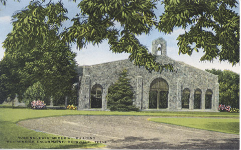 Robbins Lewis Memorial Building, Westminister Encampment, Kerrville, Texas. "One finds all sorts of recreation in this Kerrville area; swimming, horseback riding, golfing, tennis, fishing and hunting, etc. One will also find dude ranches, with a glamour and romance to be found only in this setting." Card No. 4080.