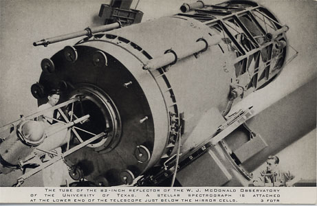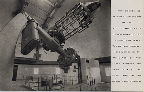 "The 82-inch reflecting telescope of the W. J. McDonald Observatory of The University of Texas. The 82-inch concave mirror, made of pyrex glass is 11 and three fourths inches thick at the edge and weighs about 5600 pounds."