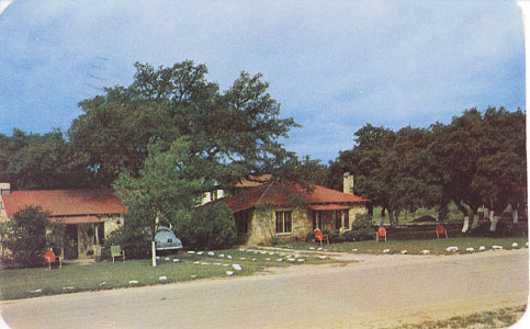 River Oaks Courts - Medina, Texas. "'A Home away from Home,' for the entire family. Kitchenettes, refrigerators. Simmons mattresses, swimming and picnicing. In the heart of the beautiful Texas hill country, on Highway 16. Cool, clean and quiet. Weekly and monthly rates. Open year round. Ideal climate. Mr. and Mrs. Guy Stroup, Owners. Phone 2F2." Card No. 47182, postmarked June 30, 1952.