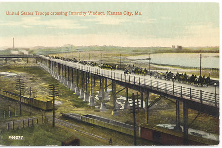 "United States Troops crossing Intercity Viaduct, Kansas City, Mo." One-cent postcard no. P-14277