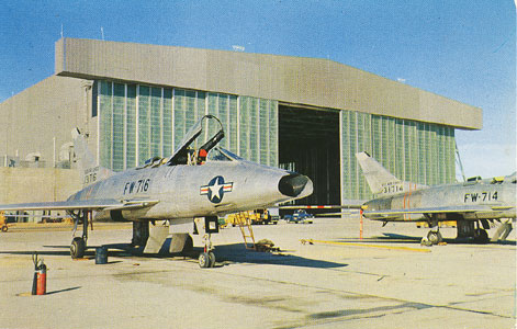 "F-100 Super Saber -- Edwards AFB, California. New supersonic air superiority fighter, with a 45 degree sweep on the wing and tail. Also shown is the new Maintenance and Modification Hangar, the largest in the Air Force, which, with adjoining shops covers over nine acres. Edwards AFFTC is one of ten Centers of the Air Research and Development Command." Post Card No. H-2200 -- 18228, postmarked August 24, 1956.