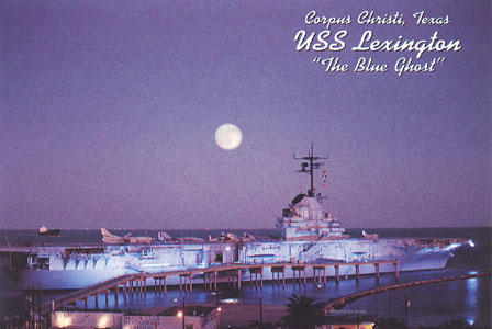 "Corpus Christi, Texas, USS Lexington 'The Blue Ghost'." Card No. FW-336. "USS Lexington CV-16. A scene to be admired while driving over Corpus Christi Harbor Bridge at Disk. . .the beautifully lighted BLUE GHOST. . . so named because Japan's Navy made numerous claims to have sunk her. The Lady Lex is a floating Museum berthed jus offshore from Texas State Aquarium and Corpus Christi Beach." Card purchased May 23, 1999.
