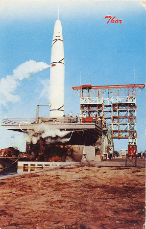 "Air Force Missile Test Center, U.S.A.F. SM-75 Douglas THOR. The THOR is an Air Force intermediate range missile undergoing test flights over the 5000-mile test range of the Air Force Missile Test Center." Card No. S-9604-B, postmarked July 2, 1963.