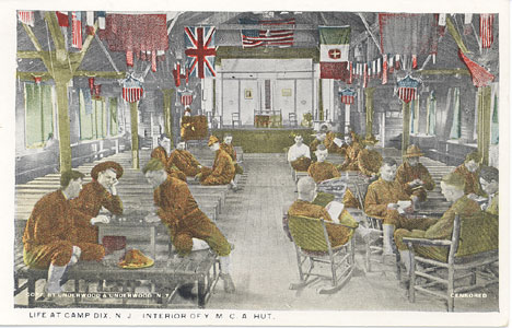 "Life at Camp Dix, N. J. - censored - On the left are bundles of civilian clothing to be sent home by the new soldiers. On the right are soldiers sending home letters and purchasing postcards at the U.M.C.A. Also library well stocked with good books."