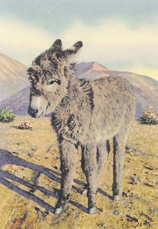 "Rags" N-4 -- "I Want My Mama" "When the photographer found this baby burro and its mother out on the hot desert--it was an effort to separate them. The baby would call pitifully for it MAMA. One-cent postcard