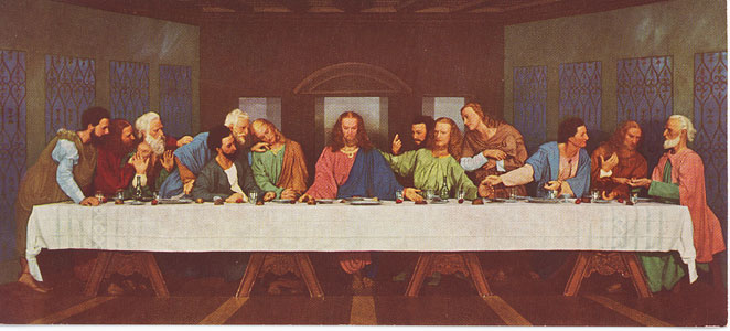 "THE LAST SUPPER" in dramatic, life-size, natural color wax figures, can be seen in Santa Cruz, California, at the Galleries of the Santa Cruz Art League, Inc. Copyright 1951, Webber Photo.