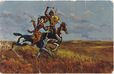 No. 16 -- Copyright 1940 by L. H. Larsen. "Range Feud. Taken from an original oil painting by the noted cowboy artist and poet, L. H. "Dude" Larsen. One cent Post Card No. 12969.