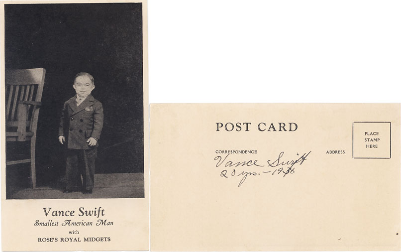 1936, autographed postcard. Vance Swift, smallest American Man with Rose's Royal Midgets.