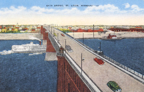 "Eads Bridge, St. Louis, Missouri -- 111. Eads Bridge, the foot of Washington Avenue, was completed in 1874, having required ten years for its construction. Cost $10,000,000. The bridge is always illuminated at night and is an imposing sight." Card No. 9217N.