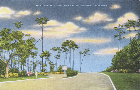 "Turn at Bay St. Louis, Highway 90, Gulfport, Miss. -- 93. This is a good place to live, being one of the nation's healthiest communities. Nearby are golf courses, numerous, shuffleboard courts, beautiful drives, good motion pictures, theatres, shops, good salt water beaches for warm days and almost always the golden sunshine, a great prescription to new health and joy." Card No. 23366.