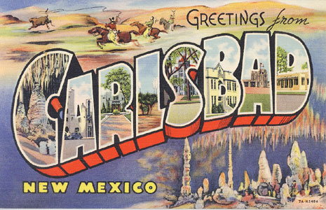 "Greetings from Carlsbad New Mexico" No. 188 County seat of Eddy (formerly historic Lincoln) county, famous for early day cattle wars and feuds of cattle men. Located in the fertile Pecos Valley it boasts a mild winter climate--average temperature 63 degrees--with fine fishing and hunting in nearby mountains. Carlsbad has the only two potash mines in America, but is best known as the Gateway to the famous Carlsbad Caverns 24 miles distant. This city of 7,500 population has ample accommodations for the throngs of visitors who visit the Caverns yearly." One-cent Post Card No. 7A-H2484 - 188, purchased June 1940.
