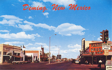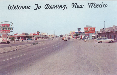 "Entering Deming - Deming, New Mexico - Deming received its name from Miss Mary Anne Deming, who became the wife of Charles Crocker who was one of the 'Big Four' of Railroad history. Crocker and his associates built the early lines of the Southern Pacific in this territory, including the line thru Deming in 1881. Deming's 99.99 per cent pure water is probably the finest to be found anywhere in the world. Come and visit u -- in the 'Kingdom of the Sun'." Post Card #677 copyright F. J. Schaaf, 1966.