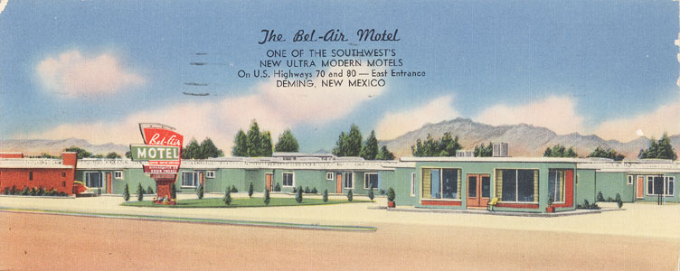 "The Bel-Air Motel, One of the Southsest's New Ultra Modern Motels. On U.S.Highways 70 and 80 -- East Entrance, Deming, New Mexico. 25 Large Luxurious Sleeping Rooms with Spacious DeLuxe Family Accommodations. Each room separately cooled -- with Refrigerated Air Individual Units. Every Room with Telephone, Every Room Steam Heated. Offering every modern convenience with the finest of furnishings - Tiled tub and shower baths. Two good restaurants next door." Postmarked Feb. 20, 1957.