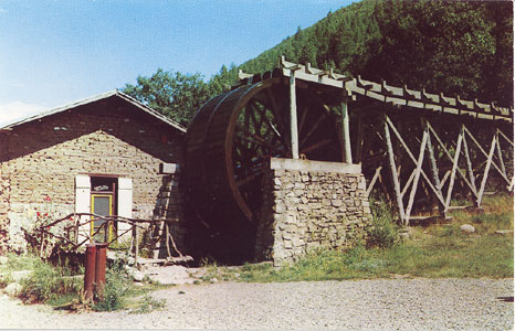 "The Old Dowlin Mill. One mile off Highway 70 at Ruidosa, New Mexico is over 100 years old. The 20 ft. high wheel is still turned by water during the summer months and corn and wheat are ground on flint stones inside the building. Billy the Kid, Pat Garrett and General Pershing were some of its more colorful visitors." Card No. 68034, purchased July 26, 1961.