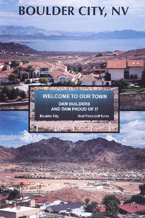 "Welcome to our Town. Dam Builders and Dam Proud of it. Boulder City - Next Three Left Turns." "Boulder City is a rapidly growing town close to Hoover Dam. Boulder City residents have both an extraordinary lake and mountain views. They are close enough to enjoy the big city excitement of Las Vegas." Card No. 3258 D43440.