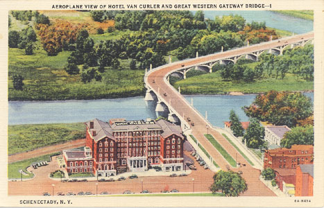 Aeroplane View of Hotel Van Curler and Great Western Gateway Bridge -- 1. Postmarked August 14, 1947.