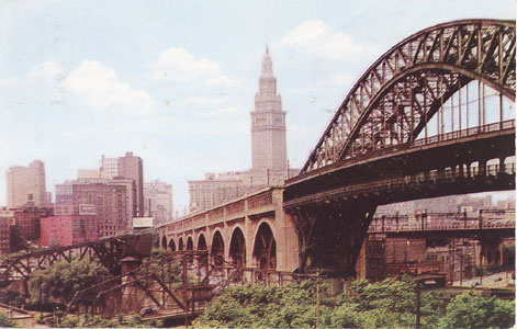 "K-4--High Level Bridge Looking East. Cleveland, Ohio, showing Terminal Tower." Postmarked May, 1958.