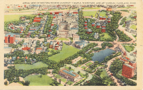 "Aerial view of Western Reserve University Campus, Wade Park, and Art Museum, Cleveland Ohio."
