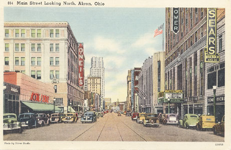 "814 -- Main Street Looking North, Akron, Ohio" Post Card No. 69858, Postmarked November 17, 1942.