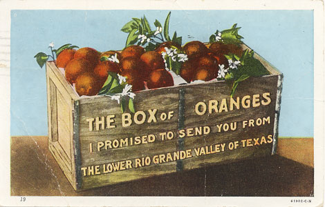 "The Box of Oranges I promised to Send You From The Lower Rio Grande Valley of Texas." Post Card No. 61902-C-N, postmarked July 8, 1946. "America's Best Grapefruit and Oranges Grow in Texas Valley -- Gateway to Mexico".