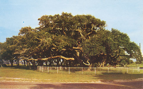 "The Big Tree, on Goose Island State Park, near Rockport, Texas. One of the largest oaks on earth, this huge tree is estimated to be 2000 years old." Postcard No. 48832.