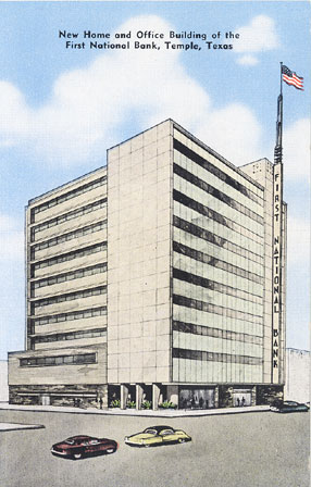 "New Home and Office Building of the First National Bank, Temple, Texas. Home of the First National Bank, the most Modern Bank and Office Building in Central Texas - 10 stories high - 86,500 square feet of floor space, providing perfection in light and office design. Every modern convenience, including all-season air conditioning, high speed elevators and Motor Banking in Basement." Post Card No. 31674.
