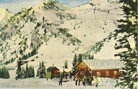 "ES-146 Alta, Utah. Peruvian Lodge nestled below Hellgate Clifts, as seen from Wildcat Run. Alta has many fascinating ski runs for every class of skier, and excellent snow conditions from mid-November through April 305h." Postmarked December 16, 1958.