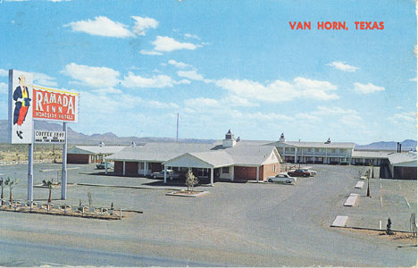 "Ramada Inn. 60 Unites - TV - Room PHones - Heated Pool - Restaurant, Beauty Shop and Barber Shop. Highway 80 East, Van Horn, Texas." Postmarked August 1967. Card No. 8945.